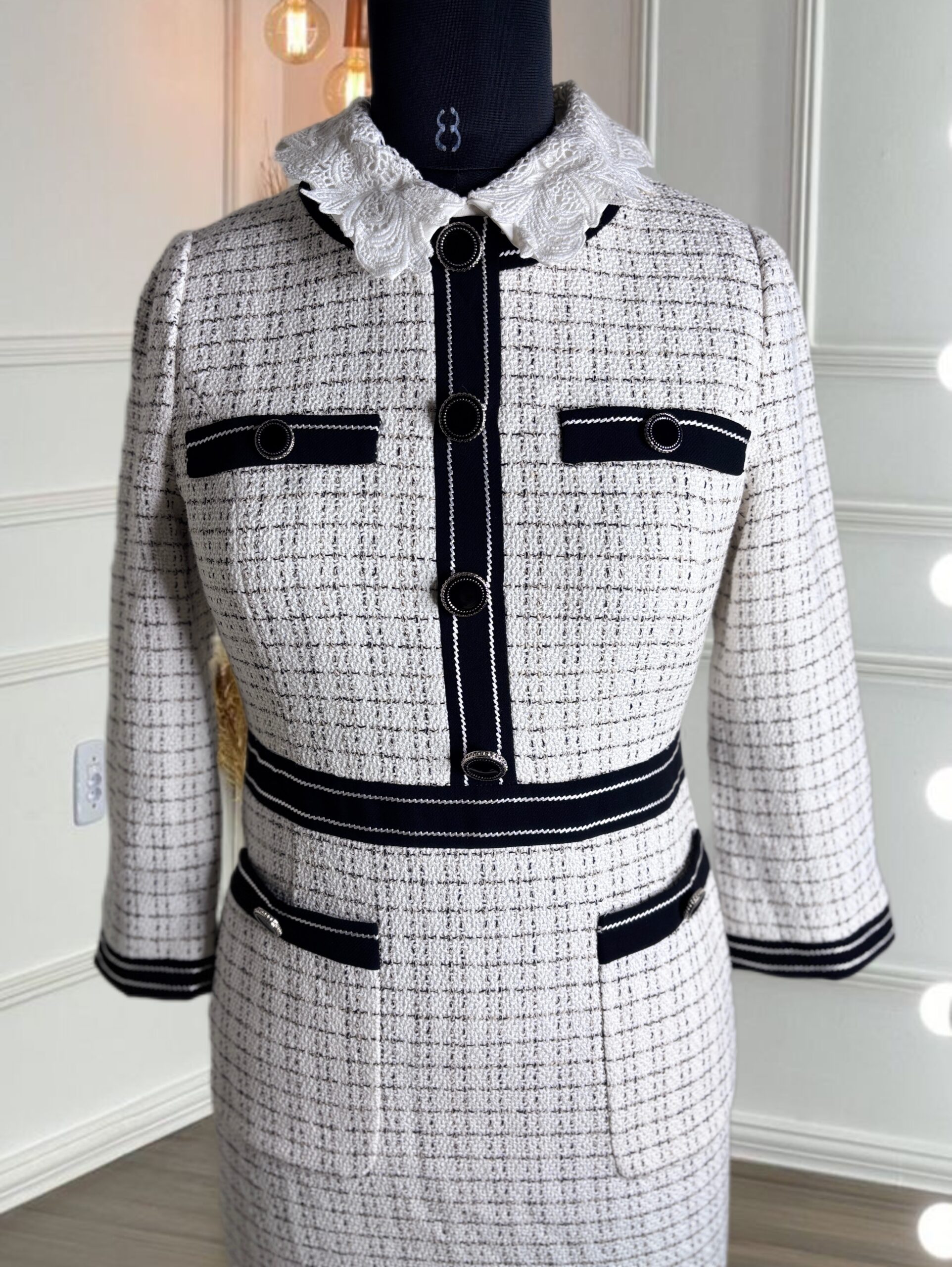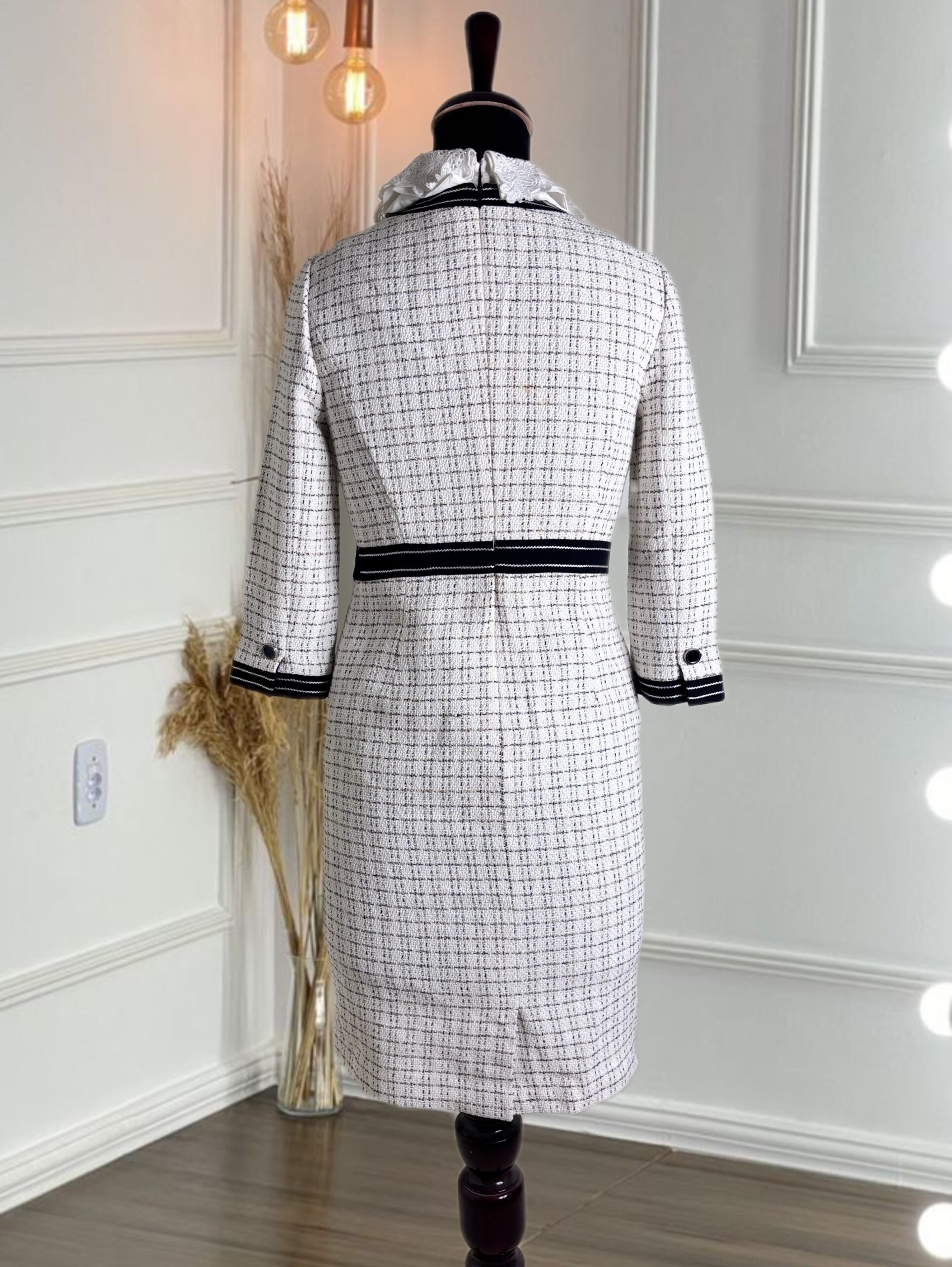 Exude timeless sophistication in this Korean-inspired tweed dress. Designed with a structured silhouette, it features a chic checkered tweed pattern, contrast black trim detailing, and button accents that elevate its polished look. The delicate lace collar adds a feminine charm, making it perfect for formal events, office wear, or elegant day outings.
